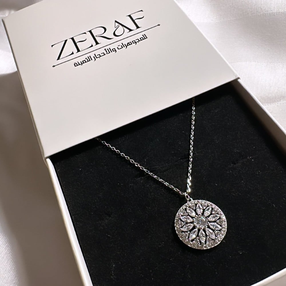احصلي على إطلالة جذّابة مع قلادة شمس المصنوعة من الفضة عيار 925، مرصعة بالزركون البرّاق. 🩵💎